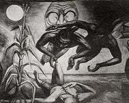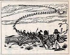 長老はそう言うと、全員の荷物を集めてかるがると肩にかけて坂道を登っていった。項上に着くと汚らしく地獄の底からはい上がったようななりをした、一人の女が出てきた。彼女は涙ながらに、メシカの人々に言った。