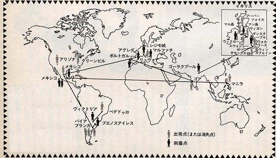 からメキシコ・シティにテレポートしたもの。出発点と到着点を示したが、線で対応する地点が記されていないものは、その地点で消失したものである。